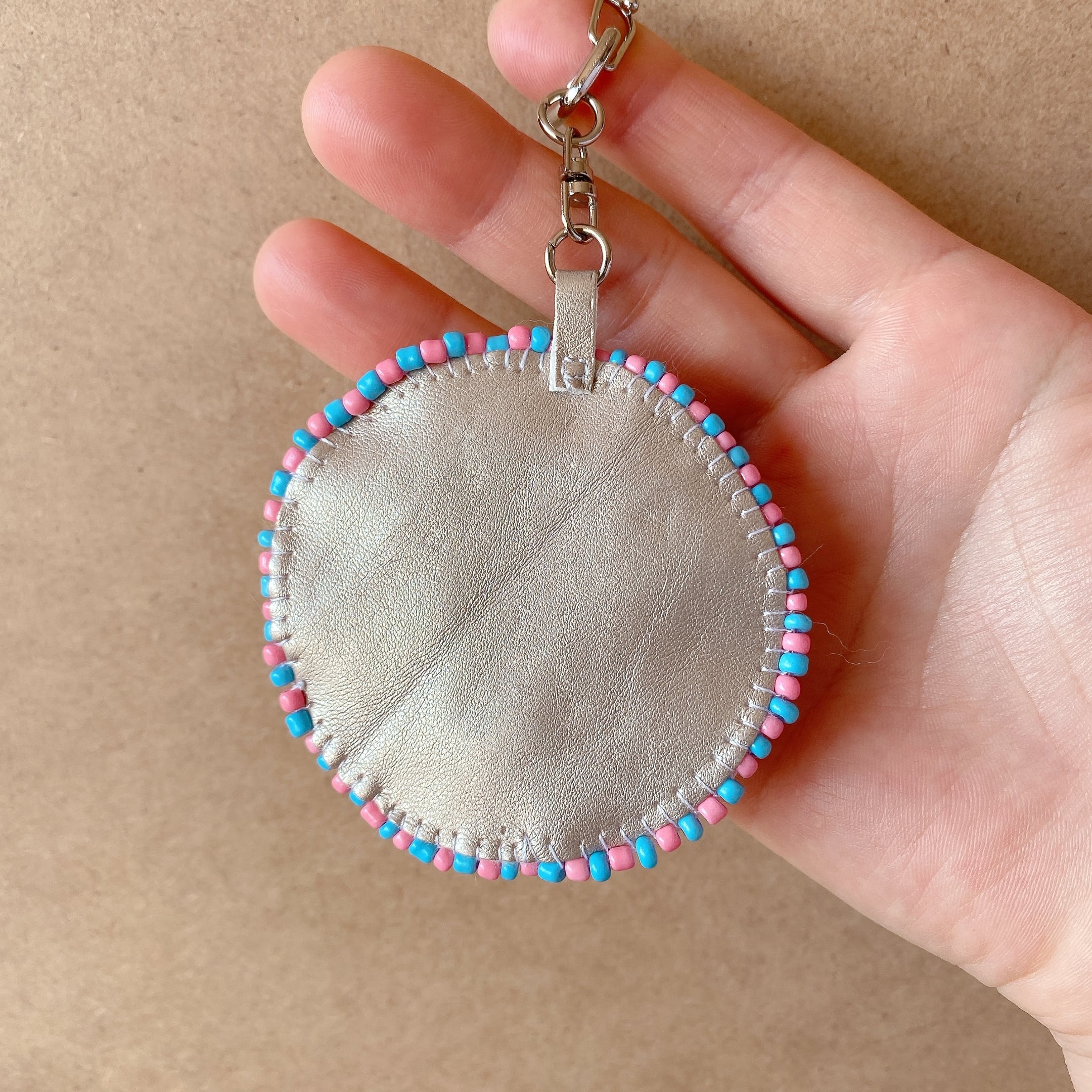 裏面はツヤのあるタイプの合皮、マットなビーズでぐるっと一周縫い付けてあります☆